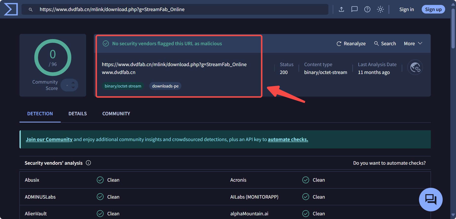 I scanned the StreamFab installer with VirusTotal — nothing suspicious came up.