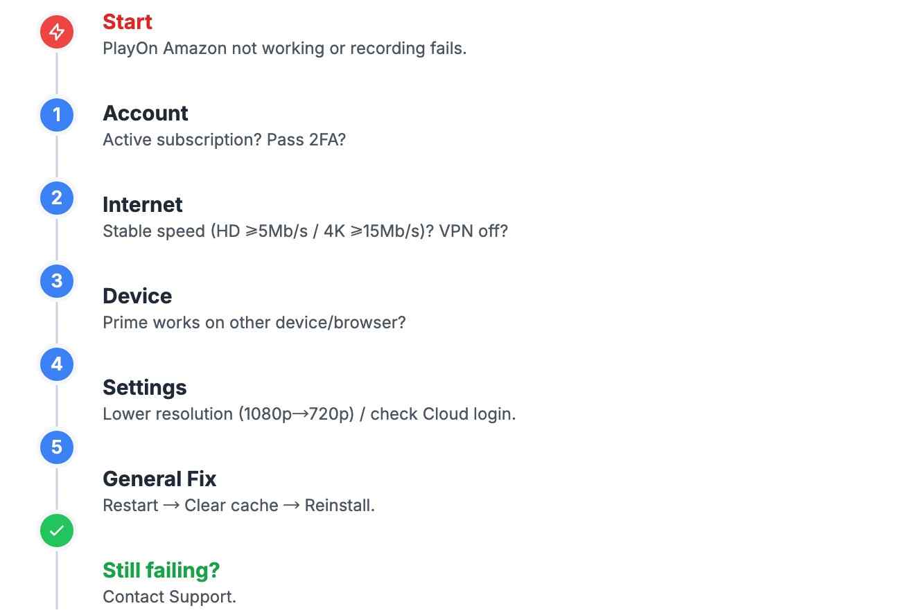 From user reports and PlayOn’s own support documentation, most “PlayOn Amazon not working” cases fall into a few predictable categories. Before you try random fixes, it helps to follow a quick self-test: