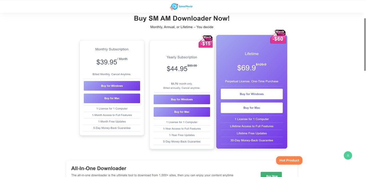 SameMovie offers three plans: Monthly, Annual, and Lifetime plane.