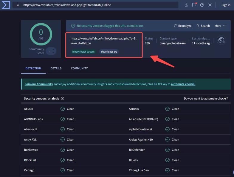 🔒 I ran the StreamFab installer through VirusTotal, and nothing suspicious came up.