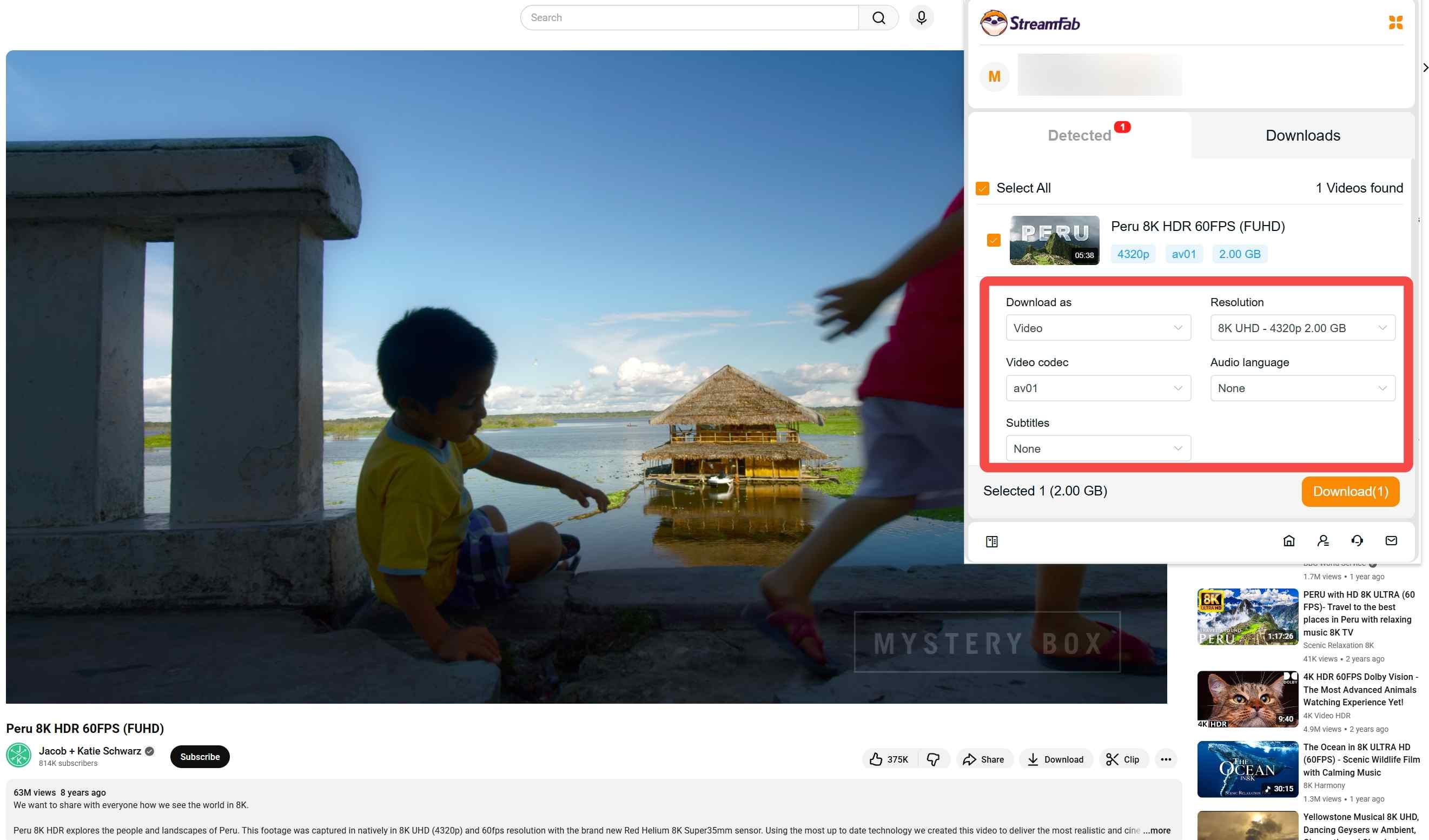 In the extension panel, select the resolution, codec (such as H.264/VP9/AV1), audio track, and subtitles. Confirm your selection to start downloading.
